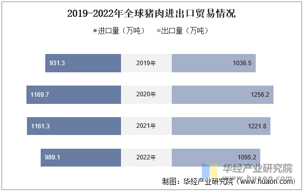 从进出口商业环境来看,近年来全球猪肉进出口规模全体呈增加的态势。2022年全球猪肉进口量为989。1万吨,同比下降14。8%;出口量为1095。2万吨,同比下降10。4%。
